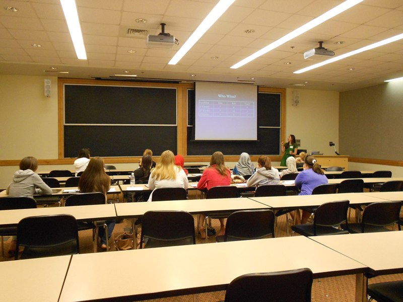 The day started with some breakfast and then two simultaneous talk/activities. Half of the group was in one room doing some math games and puzzles, led by Eva Szillery, and in the other room I gave a talk about voting systems and Arrow’s Impossibility Theorem called “How to rig an election”. Then halfway through the morning the students switched, and we gave our talk and led the activities once more. This was nice because it gave me a chance to talk to every student during the activity. However, I think my talk was a little passive compared to games and puzzles, so I was definitely not the fun one. It’s OK, though, I think some girls were definitely interested, and having different types of talks is good because you appeal to different people.
