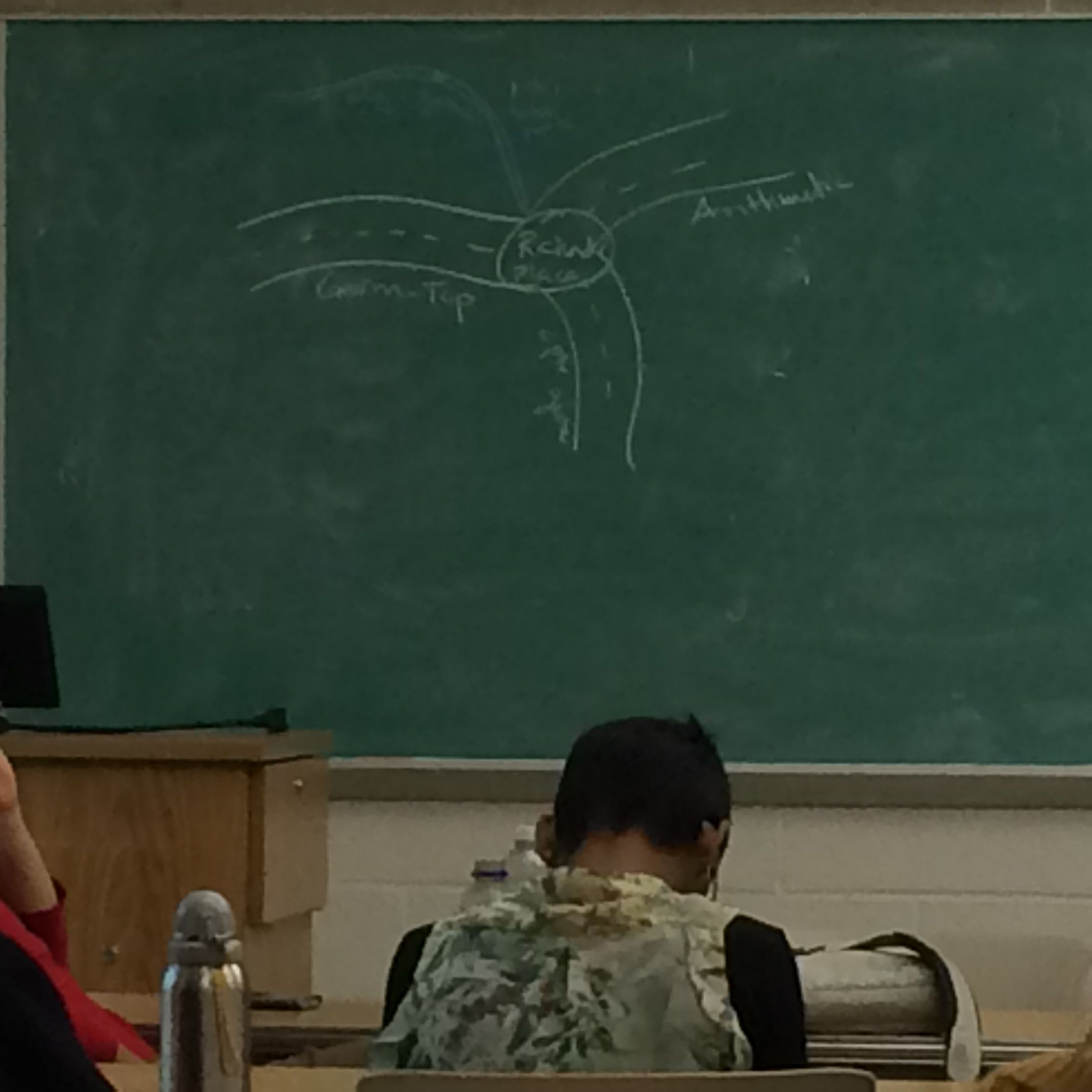 Being a non-expert in the area, I was happy that the talks were introductory and accessible. I particularly enjoyed Anand Patel‘s lectures on “What Makes a Curve Special”, but mostly because he was the closest in the “crossroads” to my area. The topic was chosen, Richard explained, because moduli spaces show up in many different areas of mathematics, like Geometric Topology, Complex Geometry, Arithmetic, and Algebraic Geometry (the latter two being more familiar to me than the former). Patel drew a nice picture of his interpretation of these crossroads (on the left in really poor resolution), and he made the algebraic geometry route a bike path “because algebraic geometers are greener and nicer to the environment.” I really liked the idea of bringing together young mathematicians with slightly different backgrounds but working on similar ideas. This is exactly the kind of situation that leads to good collaborations.